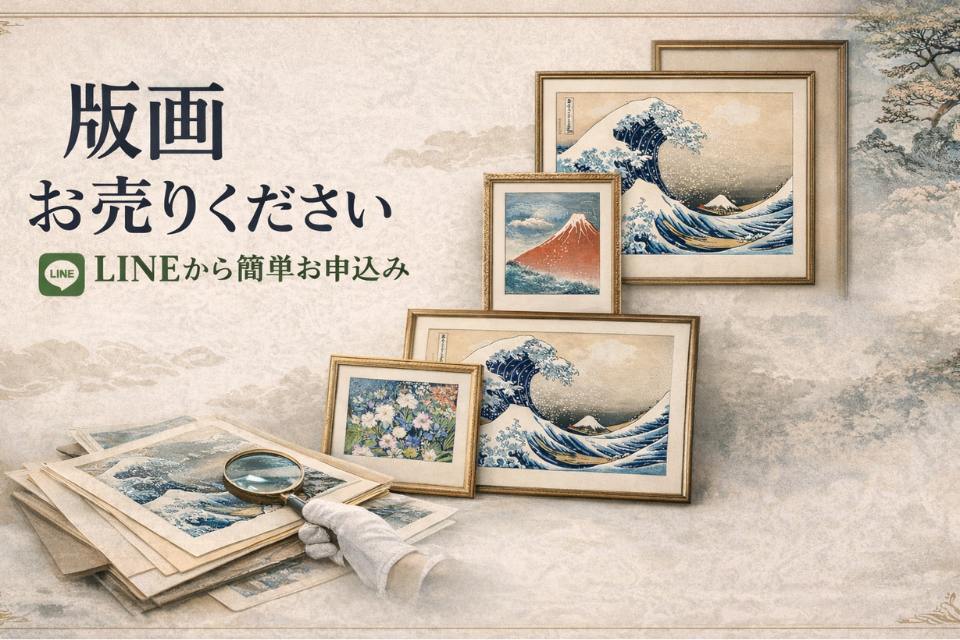 版画の買取をご検討中でしたら、まずはLINEから簡単にお申込みください。浮世絵、木版画、銅版画、リトグラフ、シルクスクリーンなど幅広くご相談承ります。古い版画、作者不明、サインが読めない作品、シミやヤケのある作品でも、出張買取と宅配買取で全国対応しております。お電話でのご相談も承っております。